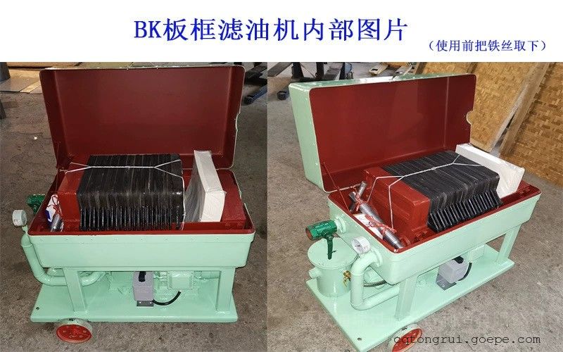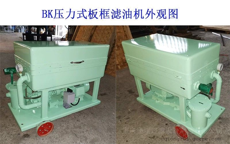 BK板框式压力滤油机由过滤床、油泵和粗过滤器等元件组成,滤板和滤框间衬有作为过滤介质的滤纸或滤布,凭借压紧装置的压力将滤板和滤框固定形成一个单独的过滤室,被压紧在滤板和滤框之间的滤纸或滤布起过滤作用。