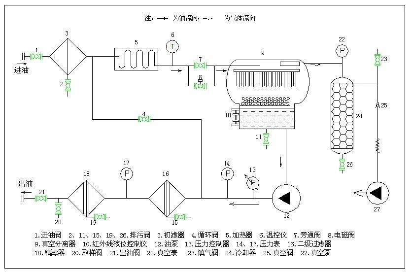 由真空分离器上部排出的水蒸气,首先经冷凝器降温除湿后,进入冷却器中再次冷却,冷凝水进入储水器中排出,经两次冷凝除湿后的气体,后由真空泵排向空中。真空分离器中经真空汽化脱水后的干燥油液,经输油泵由负压升为正压,经过滤后,净油从出油口排出,完成整个净油过程。