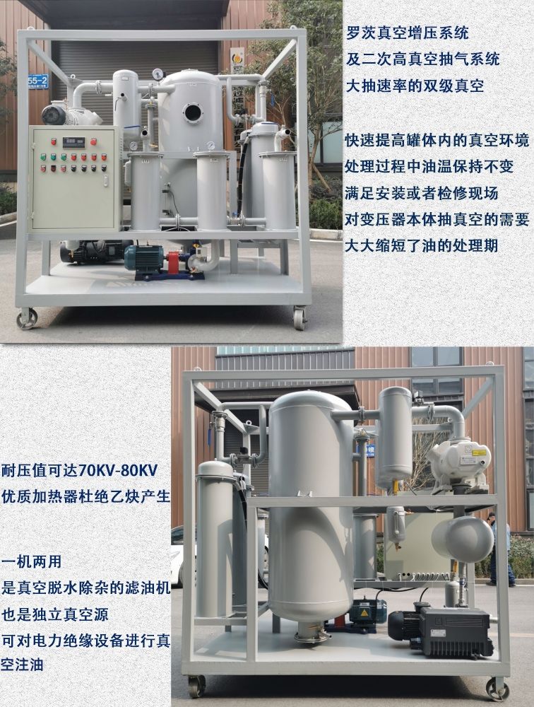 1、ZJA系列真空滤油机增加了罗茨真空增压系统、二次高真空抽气系统、快速脱水脱气,克服了真空滤油机在真空度高时排气量急剧下降的弱点,一次循环就相当于两台普通高效真空滤油机的效果。