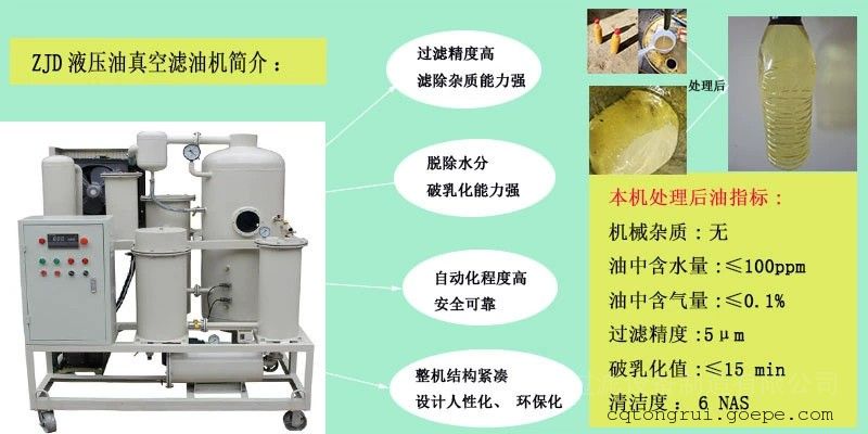 ZJD系列液压油专用真空滤油机可对机械油、液压油、压缩机油、冷冻机油、冷冻机油+淬火油、轧制油、冷镦机油,热处理油、柴油、齿轮油、汽油机油等不合格润滑油品的净化处理。