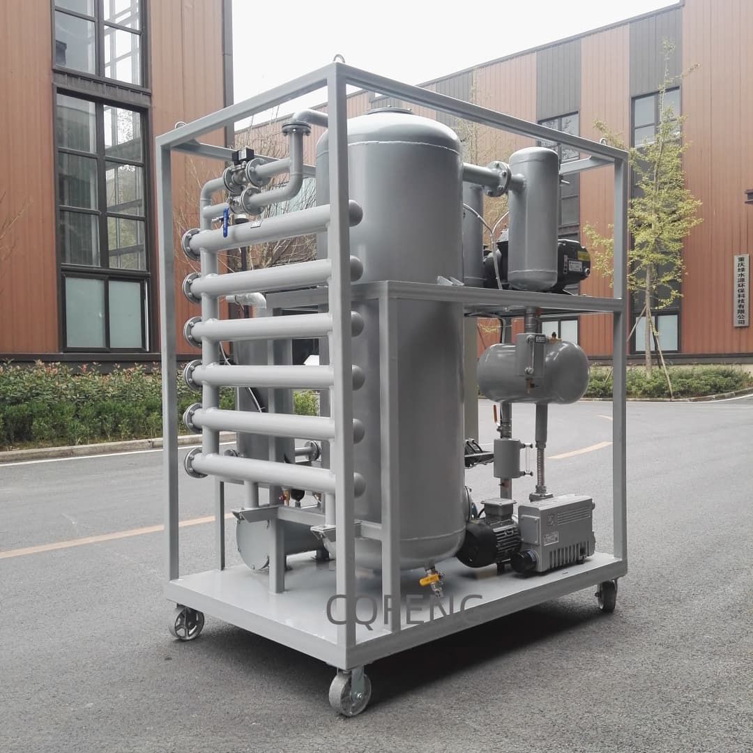 7)采用的冷凝技术,对真空分离器内蒸发出的高温高热水蒸汽及其它气体进行冷凝、干燥处理,增强设备的有效输出功率,大大延长真空泵的使用寿命;双级真空滤油机技术: