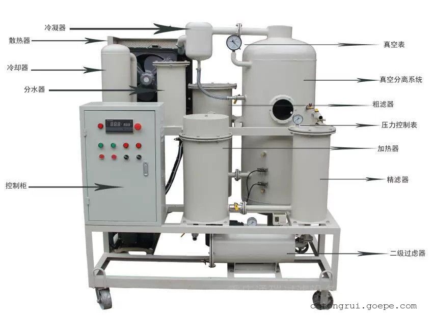 液压油、机械油、冷却油等润滑油在运行过程中,水分、气体、挥发物质和杂质由于各种原因不可避免会混入润滑油中,加速油的氧化,并助长了泡沫、积垢和油泥的形成,降低了油的润滑、散热、分散、冷却等性能。同时引起金属零部件的锈蚀与磨损,影响液压系统、动力系统、润滑系统的正常运行。通瑞ZJD系列滤油机能快速脱除油液中的水分、气体、杂质和挥发物(汽油、柴油、煤油等)。提高油液品质,恢复润滑油粘度、闪点及使用性能。保证液压系统、动力系统、润滑系统的正常运行。